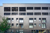 Studentisches Wohnen in mit bodentiefen Fenstern. Unten befinden sich WG-Wohnungen sowie Gemeinschaftsräume.
